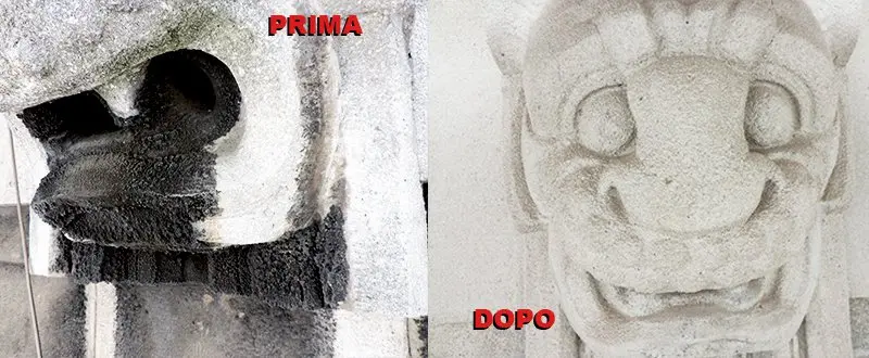 Wiederherstellung eines Kulturdenkmals durch die Entfernung der schwarzer Krusten, die durch die Ablagerung von Partikeln entstehen, die hauptsächlich aus Ablagerungen von Öl / Kohle-Verbrennungen oder Tierejektionen stammen.