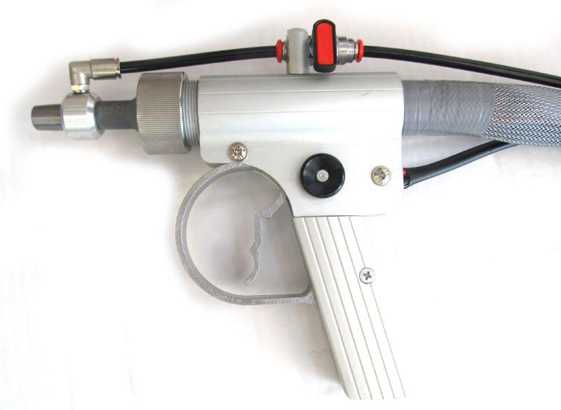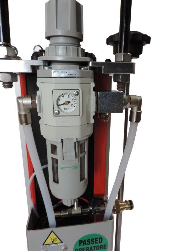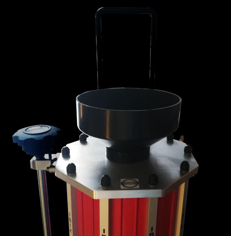 A combination of the Venturi effect generated by the special conformation of the outlet cone and the helical rotary movement system considerably reduces the compressed air demand and increases the contact area.